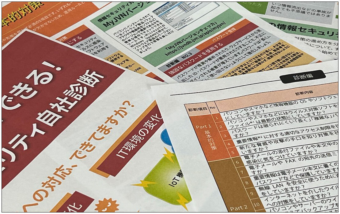 まず、「5分でできる!情報セキュリティ自社診断」は、中小企業の情報セキュリティ対策ガイドラインの付録3を使用します。同診断は25のチェック項目で構成されており、質問に回答することにより自社の情報セキュリティ対策状況を把握することが可能です。