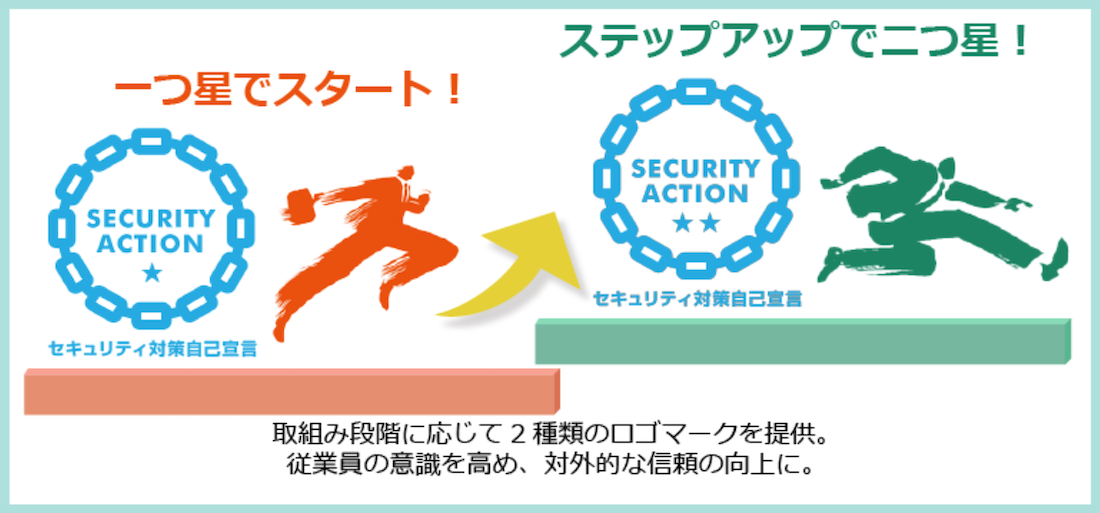 自己宣言では、目標に応じて2つのステップ、「★(一つ星)」と「★★(二つ星)」があります。体系的なセキュリティ対策に取り組むのが初めてでも段階を踏んで進めることができ、一つ星からスタートして二つ星へとステップアップすることができます。