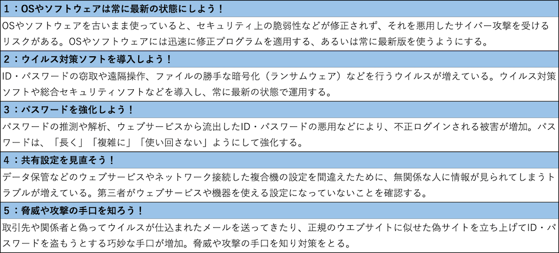 記載された5項目は、いずれも基本的なことばかりです。最低限のセキュリティ対策として必ずといってよいほど言及される項目ですが、意外と見落とされていることも多いだけに、確実にチェックしましょう。
