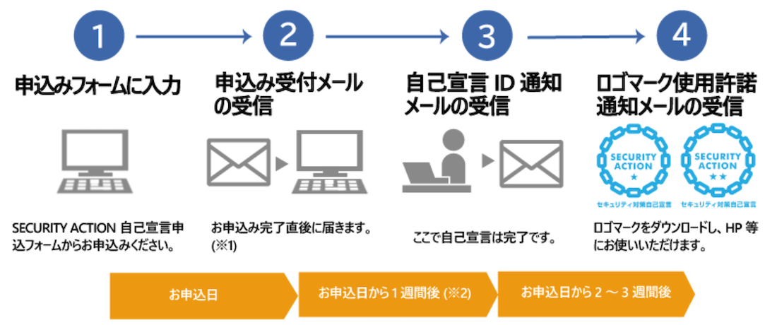 セキュリティ対策自己宣言を実施し、SECURITY ACTIONのロゴマークを使用するには自己宣言の申し込みが必要です。公式サイト内の「自己宣言申込みフォーム」から手続きを行い、自己宣言ID通知とロゴマーク使用許諾通知をメールで受け取ります。