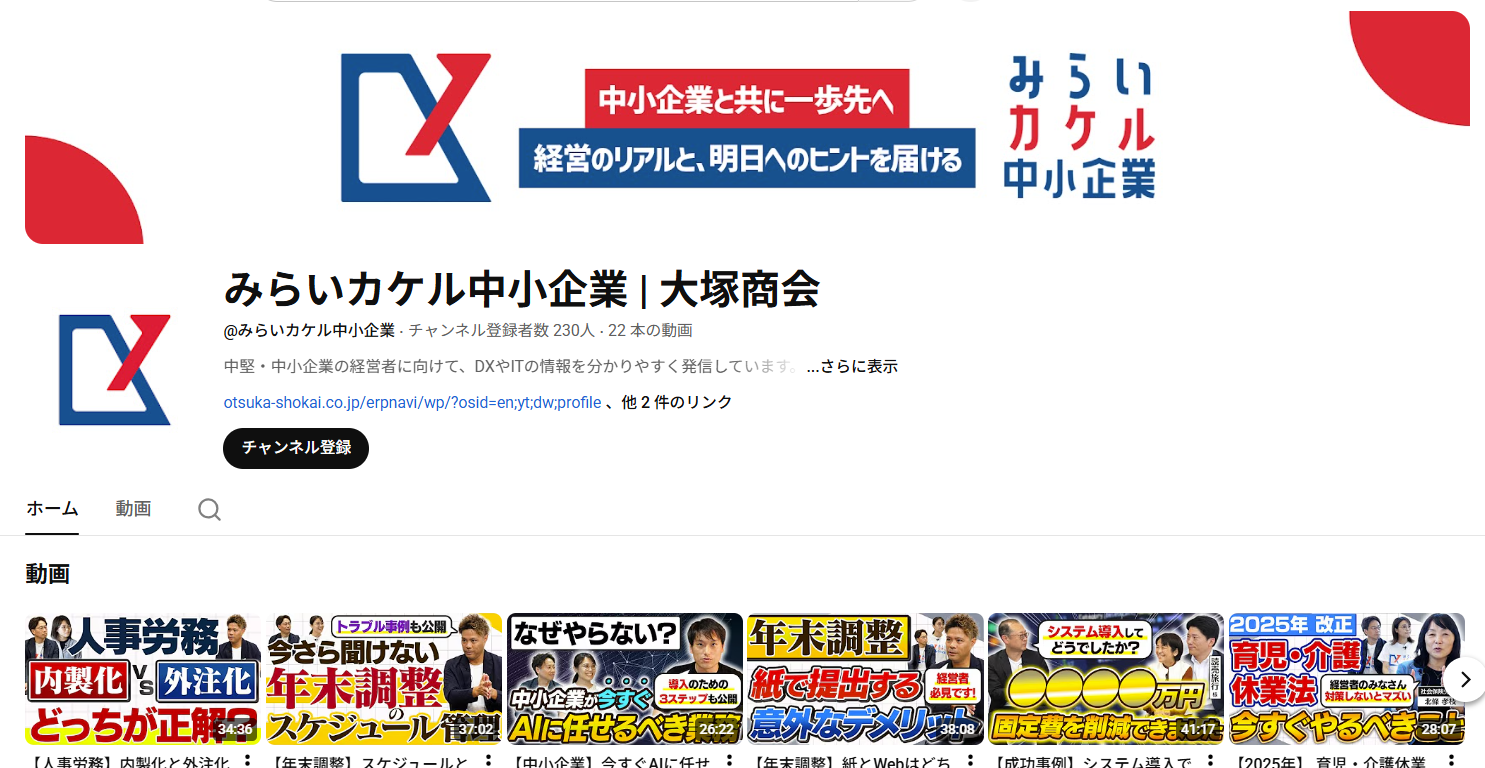 大塚商会はオフィスで必要となる幅広い商品やサービスを取り扱い、業務のあらゆる困りごとの解決を目指す「オフィスまるごと」の戦略を推進しています。その中で、製品販売と同時に、業種SI部門ではERP導入などのシステム構築も手掛けています。橋本グループ長は「みらいカケル中小企業により、当社がいろいろなことに取り組んでいる会社だと知ってもらいたい」とチャンネル開設の目的を語ります。加えて、「中小企業の場合、教科書通りのことを言ってもDXはなかなか進まない。中小企業のリアルを知っている当社が、みらいカケル中小企業を通じてDX推進のためのヒントを届けていきたい」と力を込めます。