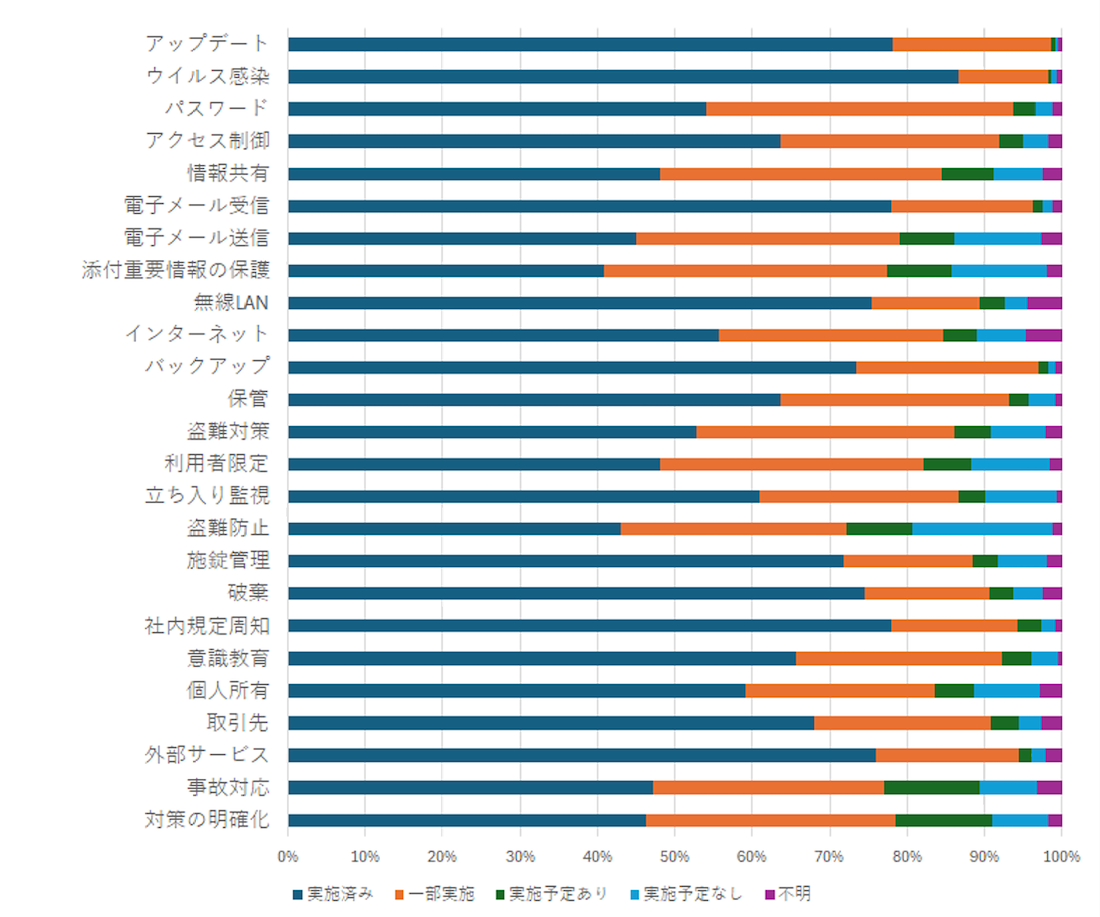 項目別調査で、一部実施も含めた実施率の割合が高かったのは「アップデート」や「ウイルス感染」、「電子メール受信」、「バックアップ」などです。