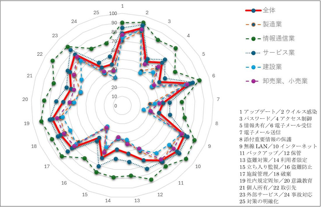 各項目の実施率の全体的な傾向は、どの業種もほぼ同じ形状となっていることから、業種の違いによる差はないといえます。ただし、チャートのサイズ感には差があるため、対策の進み具合には差が見られます。