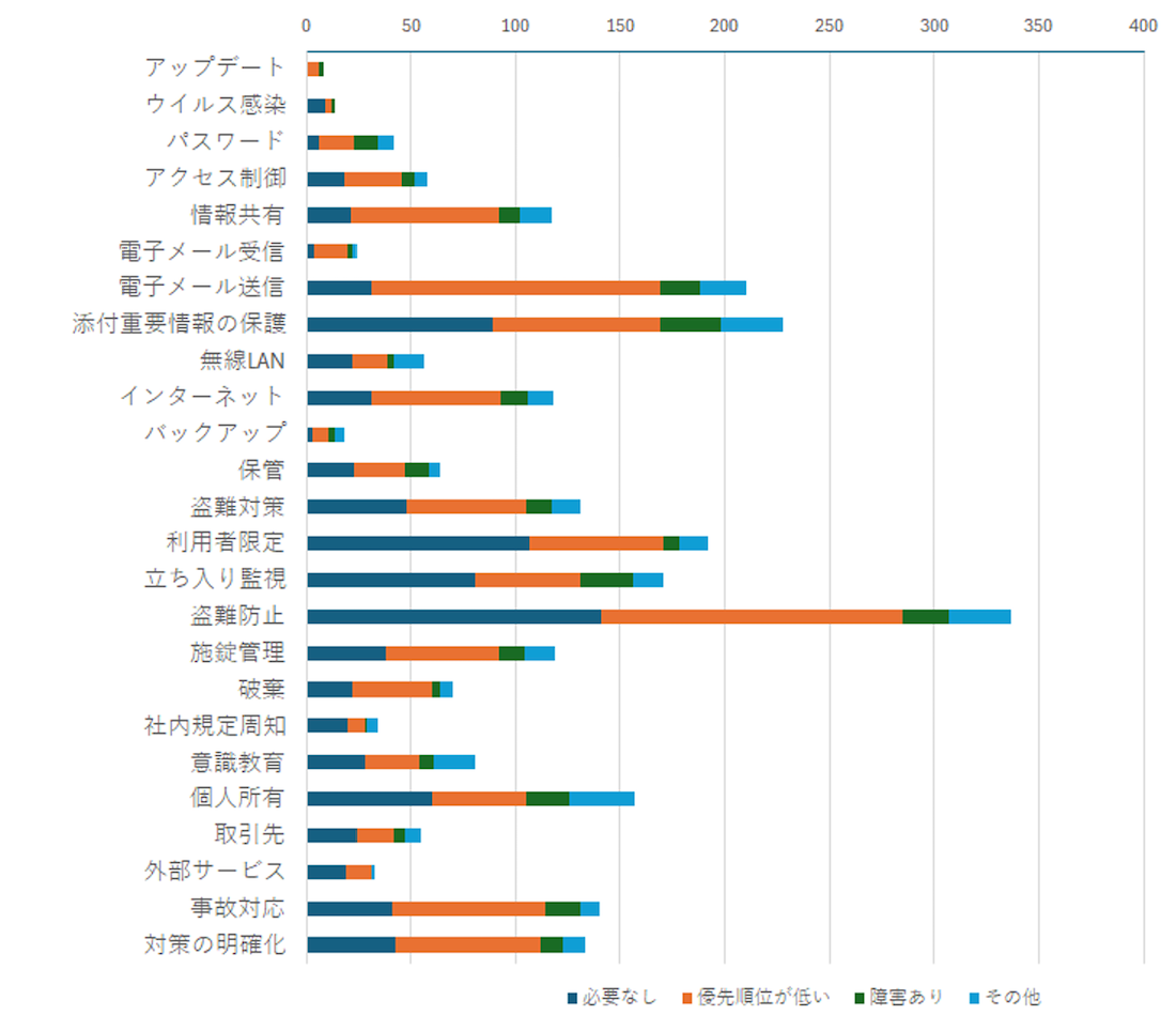 また、事務所内のノートパソコンや備品を安全に管理する「盗難防止」も実施済み事業者は少なく、実施率は50%を割っている状況で、必要ない、優先度が低いとの回答も多い項目です。類似対策として、関係者以外の事務所への立ち入りを制限する「立ち入り監視」や、オフィスの戸締りを気にかける「施錠管理」などがあり、これらの対策は実施率が比較的高くなっています。