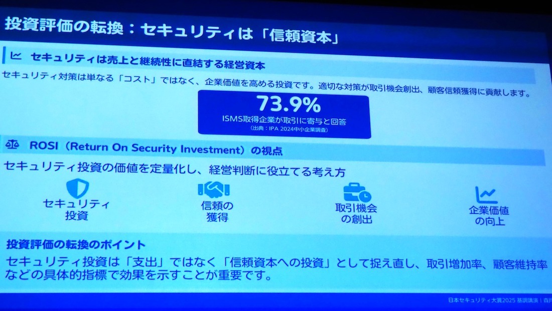 セキュリティ対策は企業価値を高める投資であり、その価値を定量化して経営判断に役立てるROSI(Return On Security Investment)の視点を持つことが大切だ(出典:「日本セキュリティ大賞」会場での提示資料)